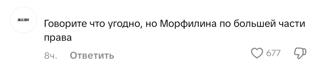 не, я вот не понимаю уже реально че вадя от морфилины хочет? она все грамотно говорит. уже звучит так, будто она его раздражает тем, что она не его марионетка и все