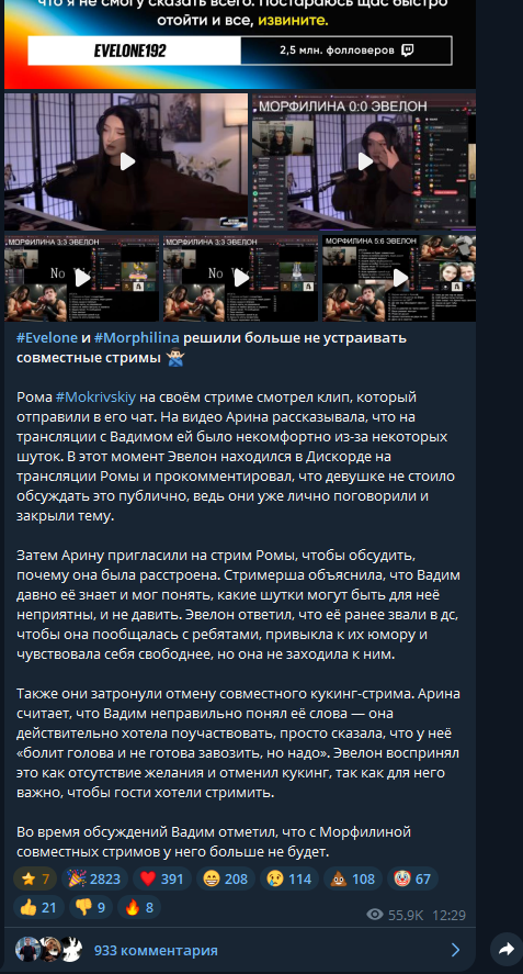 Вадиму просто было обидно, что морфилина постоянно завет его на стримы, а вне стрима не хочет общаться. Потом она на совместном стриме ведёт себя как камень и не вкладывается, как итог, после стрима он ей говорит, что не будет больше совместных стримов. Но на следующий день она запускает стрим и первым же делом отдает его ему, а сама точно также афкашит и у него появляется агрессия