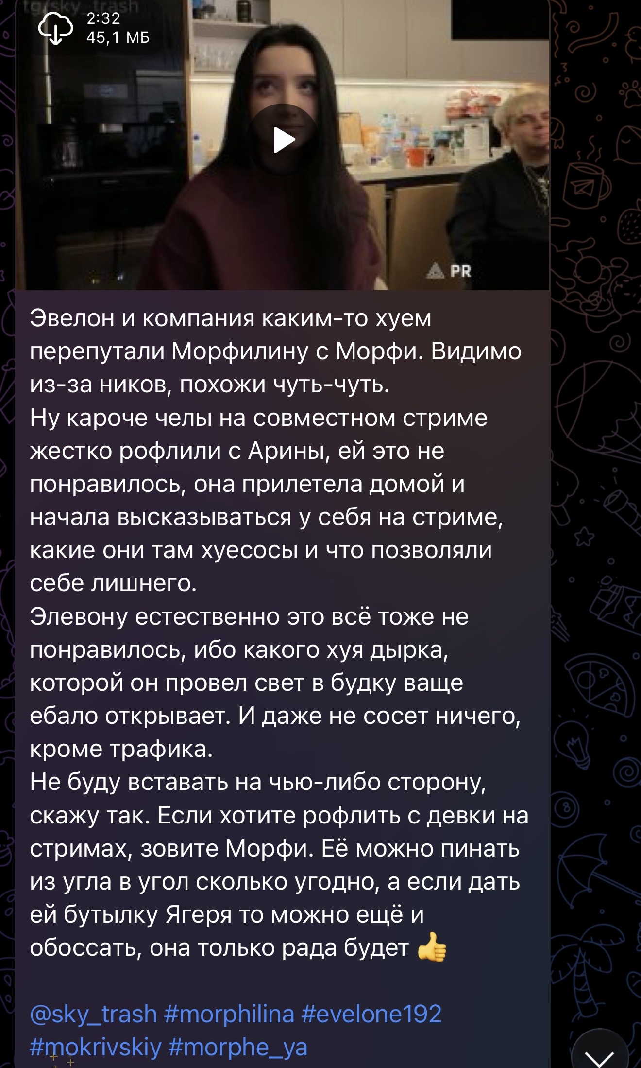 >>25564453 с морфилиной он не общался на др, после др не отвечал на сообщения, на стриме с распаковкой не общался вообще и сказал, что не знал что она даже ирл подрубать не будет, а на ирле был на нее раздражаен и даже не поехал провожать в аэропорт, так что ее приплетать вообще хуйня полнейшая