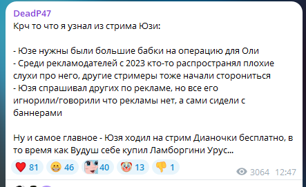 Тетя соя на ауках собирает более 100к каждый раз, а бывало и по 500 собирал. На недавнем ивенте он пару лямов собрал. Вротхуйс когда ауки проводит тоже кесов по 50 набирал. А шузи еще больше подписчиков, зрилов и т.п. было, провел бы несколько ауков за неделю или за месяц на какое нибудь фулл прохождение игры и все, ни к какой дианочке на поклон не нужно идти. Поэтому тут просто жадность сыграла, ауки стримерам уже лень проводить, в игры играть лень, даже заводить лень, им уже нужно, чтобы им просто деньги кидали за факт их существования.