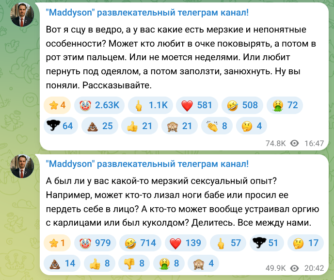 >>25574017 Этот чел залетушкин дефолтный. Смотрит и занюхивает телегу подсосов мэда с момента начала форса рыжопич(неиронично смотрит ее, пытается форсить мемы с ней). Другие телеги про мэда тоже занюхивает, пытается чет постить с рыжим говном.