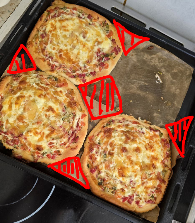 >>25576795 Самое тупое, бессмысленное просирание продуктов. Надо было раскатывать тесто на весь лист и потом резать готовую на четыре части. А так они просто треть пространства противня оставили пустыми.