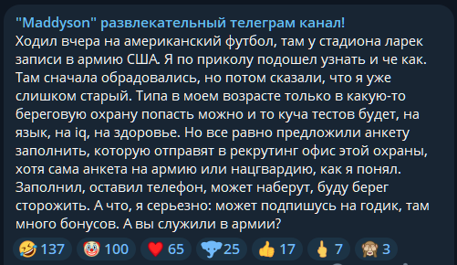 Ходил вчера на американский футбол, там у стадиона ларек записи в армию США. Я по приколу подошел узнать и че как. Там сначала обрадовались, но потом сказали, что я уже слишком старый. Типа в моем возрасте только в какую-то береговую охрану попасть можно и то куча тестов будет, на язык, на iq, на здоровье. Но все равно предложили анкету заполнить, которую отправят в рекрутинг офис этой охраны, хотя сама анкета на армию или нацгвардию, как я понял. Заполнил, оставил телефон, может наберут, буду берег сторожить. А что, я серьезно: может подпишусь на годик, там много бонусов. А вы служили в армии?
