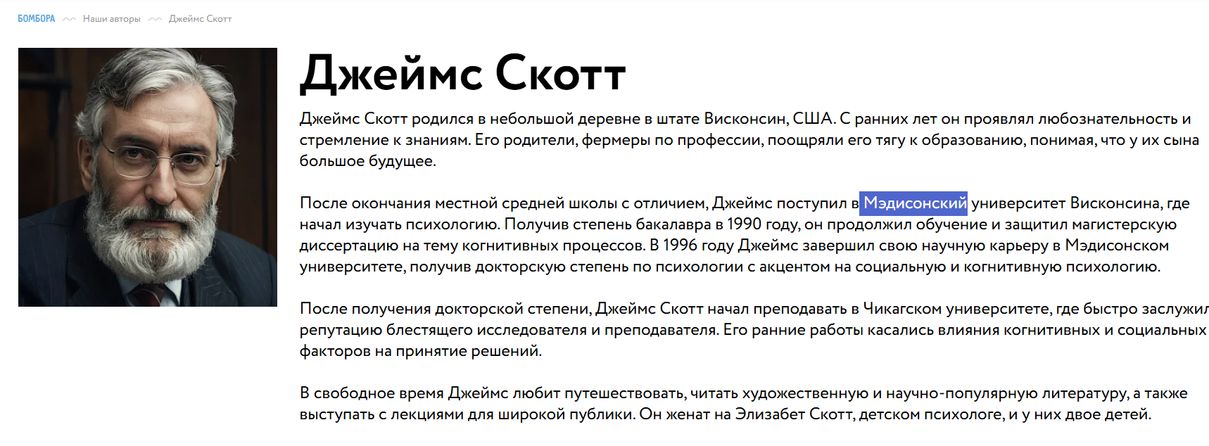 3. Профили автора отсутствуют: нет соцсетей, нет выступлений, нет интервью, нет научных работ. Для реального профессора это прям красный флаг. Для ИИ-контента — нормальная ситуация: имя есть, человека нет.