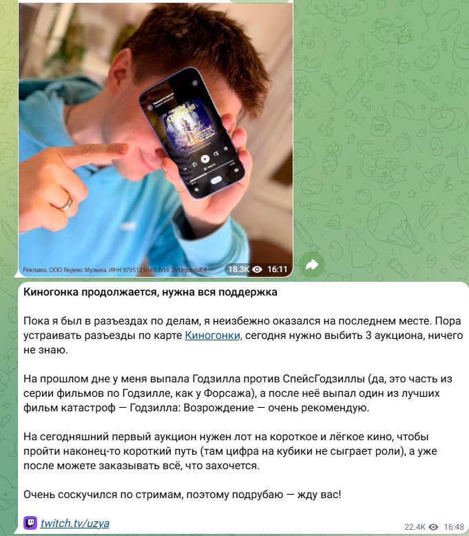 Шузя реально обыграл всех и послал нахуй дианочку с ее ивентами, единственный из участников киногонки удалил баннер с ссылкой на победителя.