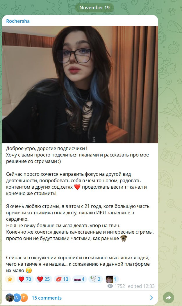 >>25609069 Ты видел ее последние стримы до стримов Сербии? Если бы она так продолжила или запускала без шипа домашние стримы, то в конечном счёте проиграла бы по онлайну