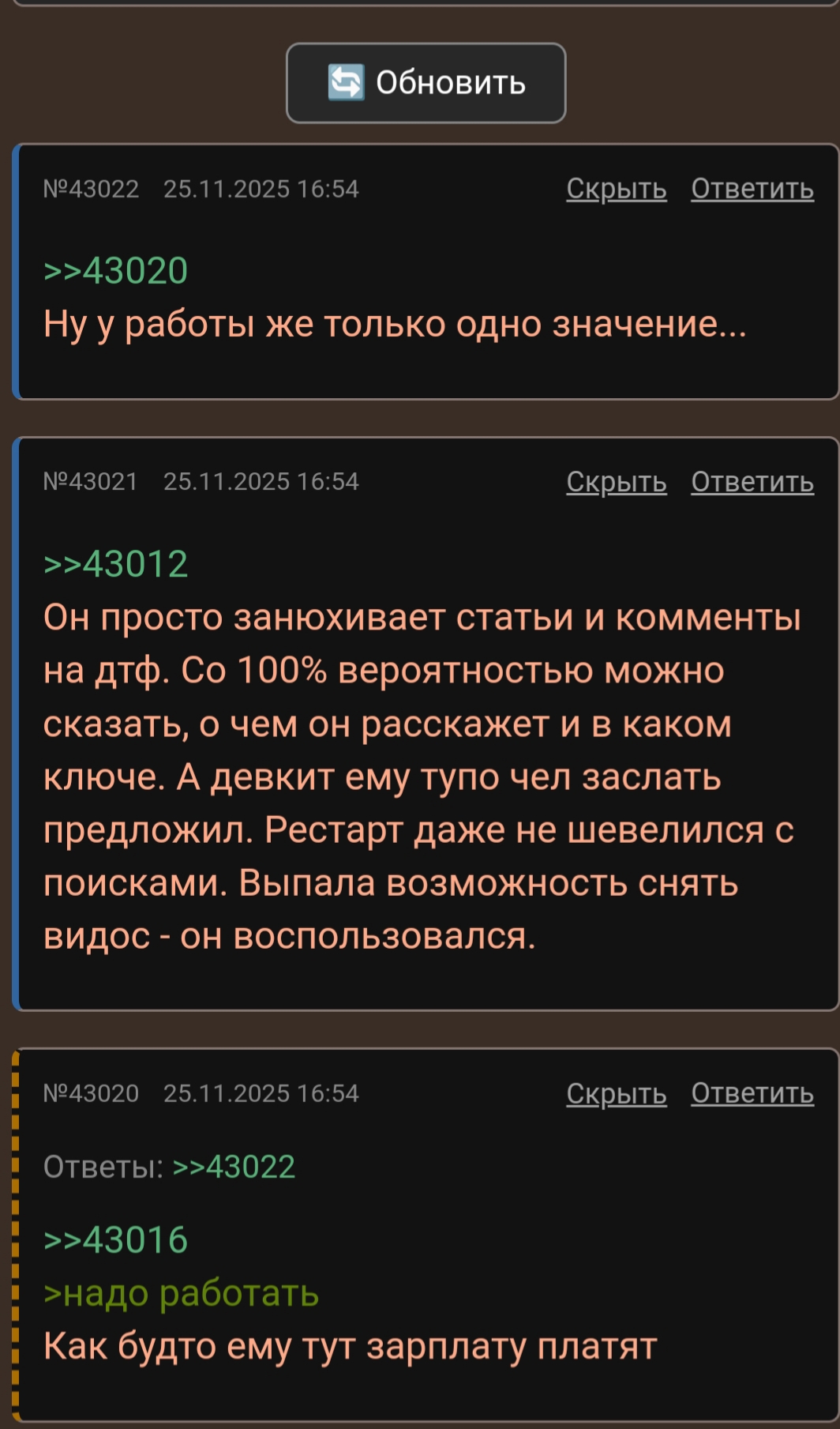 >>25646834 Есть, но постить не буду. Иначе мы уподобимся 4му, который засрал весь тред хуторским говном. Сейчас он притих, наверно мамка пожрать приготовила, но скоро вернётся и будет срать с удвоенной силой, вот увидите.
