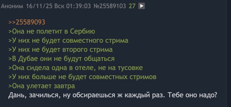 >>25652643 Если бы они все делали для стрима, то они бы не ходили в рестик в 2 и не гуляли в 2 в Дубае, где хотели в 2 покататься на колесе обозрения, а когда им сказали что в кабинке группой из 6 человек только можно, они отказались от этой идеи, видимо Наташка хотела ему соснуть там, вот и думай