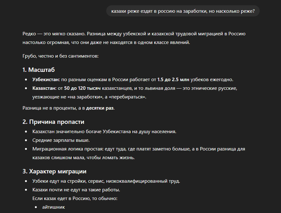Реально бредик, даже в бытовом лубочном смысле когда говорят о гастарбайтерах в России то чаще всего имеют в виду таджиков и узбеков, а не казахов. Как-то вот так вышло. Кыргызов тоже существенно меньше, они предпочитают в Турцию или даже соседний Казахстан ездить работать, но и в России их тоже хватает.