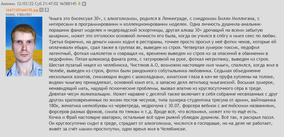>>25658075 Так, а всеравно ничего нового не сказать про Ананолия. Хотя, вот там я узнал, что он, оказывается, ходил на вписки и пьянки. Че, рили? Как она там не зацепил то педовку какую нить. Ведь был горящий сентябрь 2007.