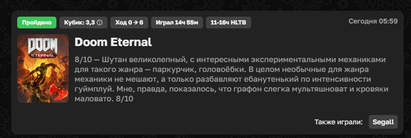 >>25654395 Например для Ильи Мэда это единственный шанс чтобы он поиграл в игру какую-либо, он не сел бы играть в Смуту, или в Мор самостоятельно. Или вот у Прадена была Мафия оригинальная, он не играл в неё в своё время, но прошёл ремейк, вряд ли он бы сел играть в неё по своему желанию, но она выиграла и он прошёл и по-своему кайфанул с культового говна мамонта.