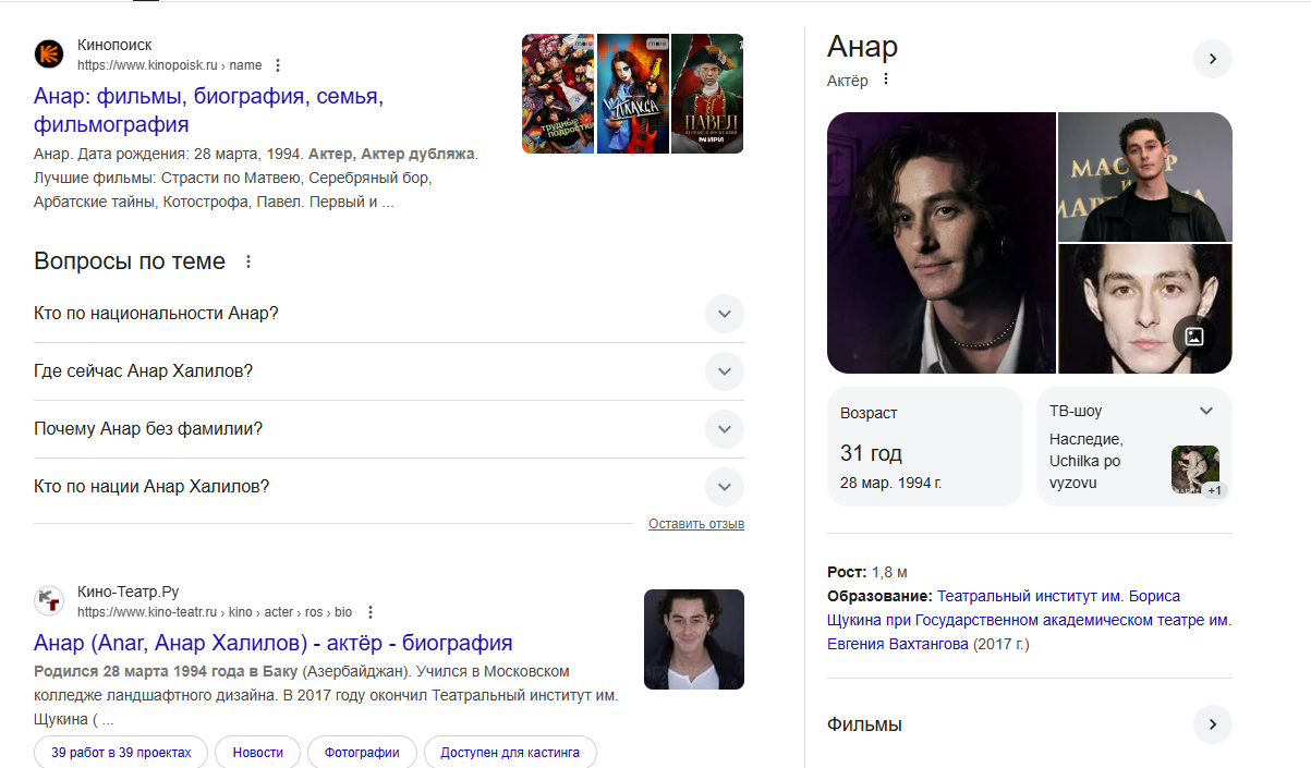 прикиньте, мне пришлось дописывать анар стример чтобы я смог его найти, потому что сначала нашло ноунеймактера который снялся в фильмах, которых в 3,5 фильмах снялся и никто его не знает