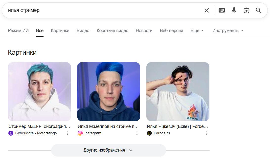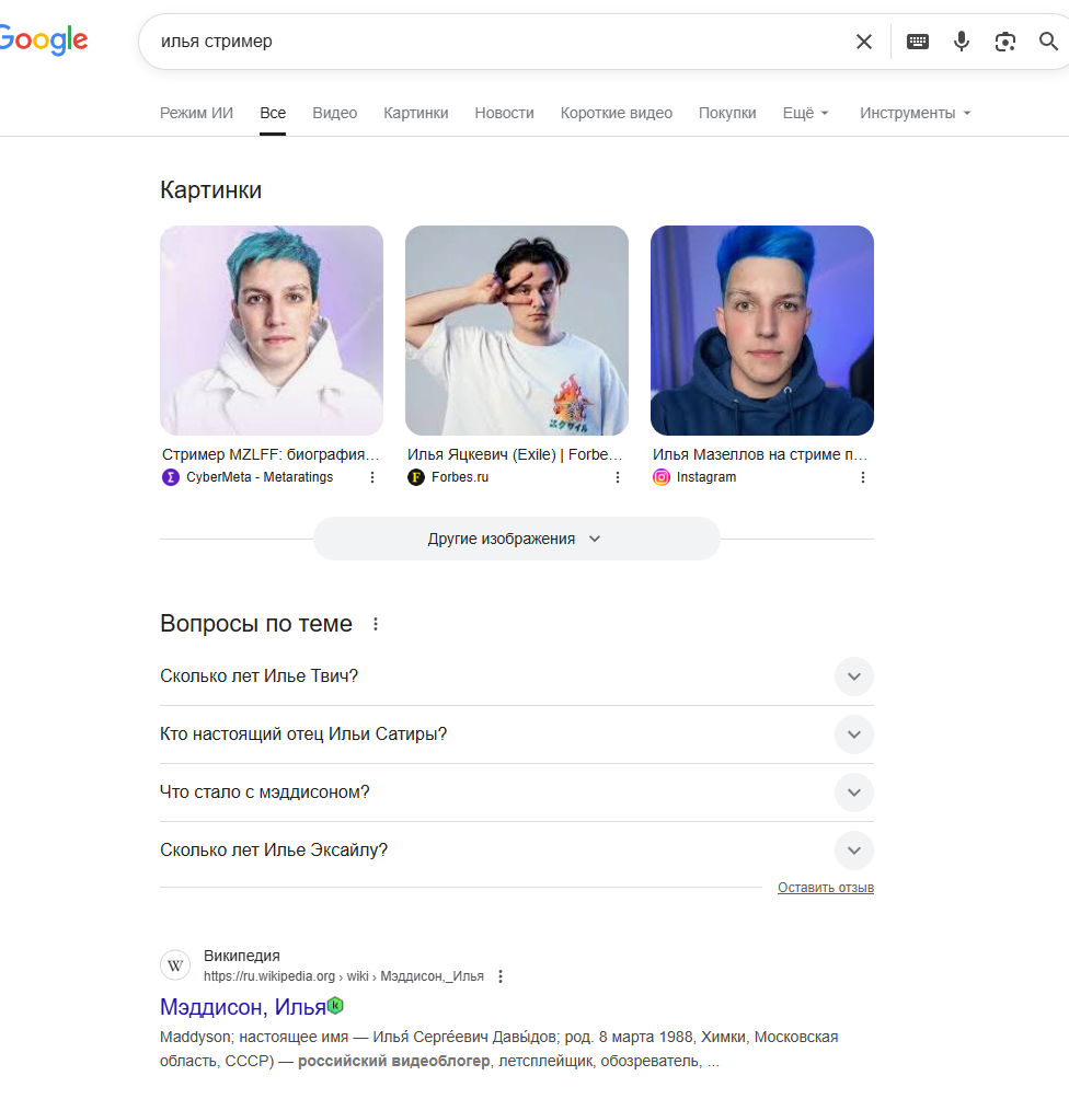 прикиньте, мне пришлось дописывать илья стример чтобы я смог его найти, потому что сначала нашло значение имени. А при добавлении илья стример вообще нашло мазелова, лол
