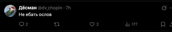 >>25679141 Можешь больше не отвечать. По твоим постам я понял что интеллектуально ты очень слаб. На уровне, я не знаю, ну может ребенка. Смысла писать (а тебе скорее всего 30+) щитпостеру с интеллектом ребенка я не вижу, потому что все общение с тобой это твои попытки пытаться оскорбить человека с которым ты переписываешься. При этом сказать толком ты не можешь ничего. Просто брызжешь слюной, материшься и неумело пытаешься в оскорбления. Но при этом не можешь связать два слова.