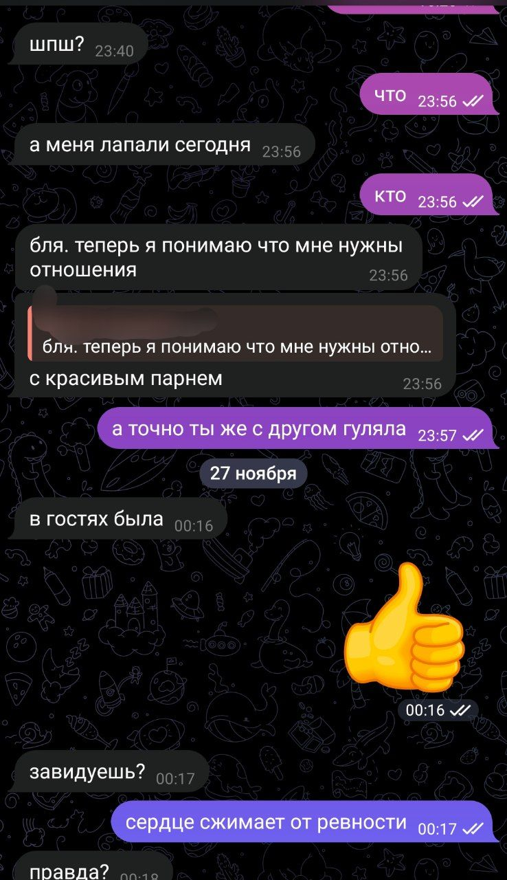 Ну у тебя явно нет шансов, максимум можно рассчитывать на запасной вариант, типа когда ее выебет толпа ахмедиков а потом бросят с ребеночком она мб про тебя вспомнит. Вот на каком то таком ты сейчас уровне. Короче, лучше шли ее на хуй чтобы время не тратить. Норм тян не будет в целом писать что ее кто то там где то лапал. Особенно тому кто хотя бы чуть чуть имеет шанс стать парнем