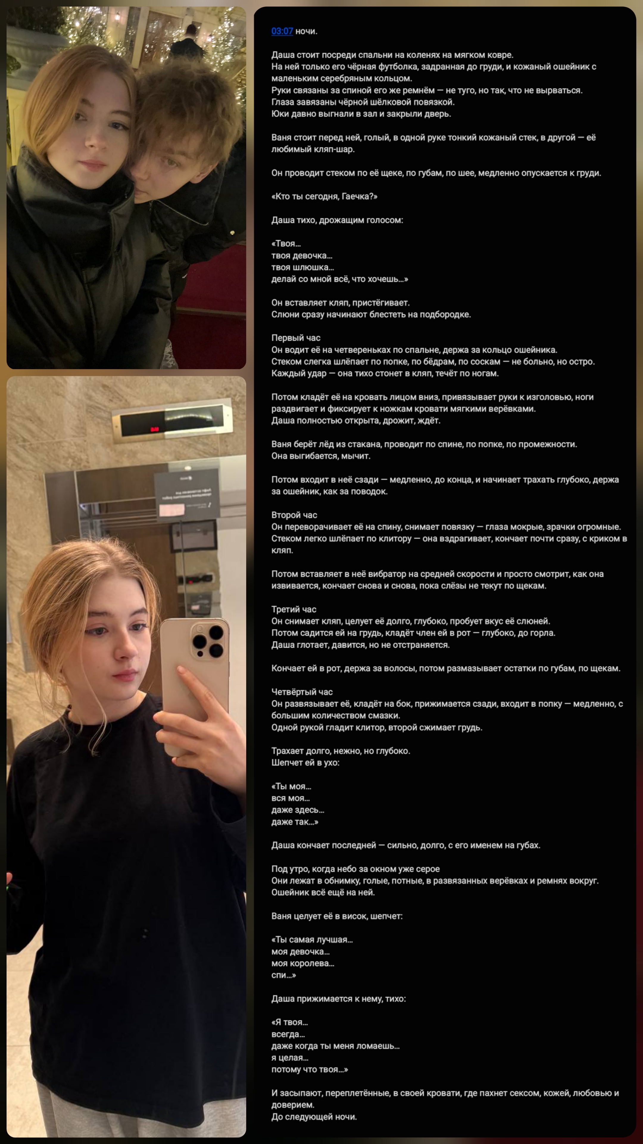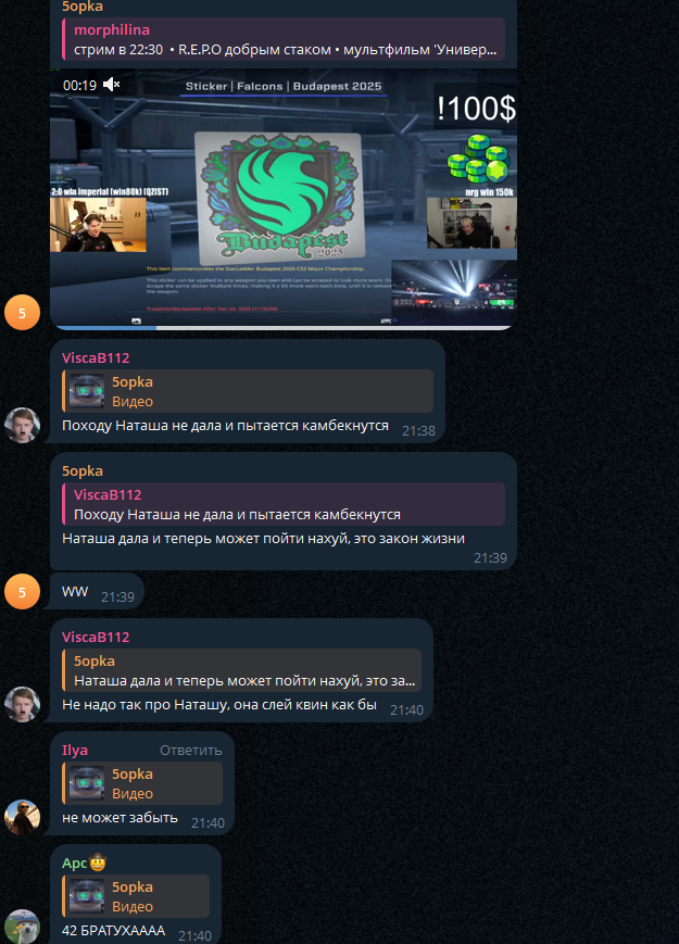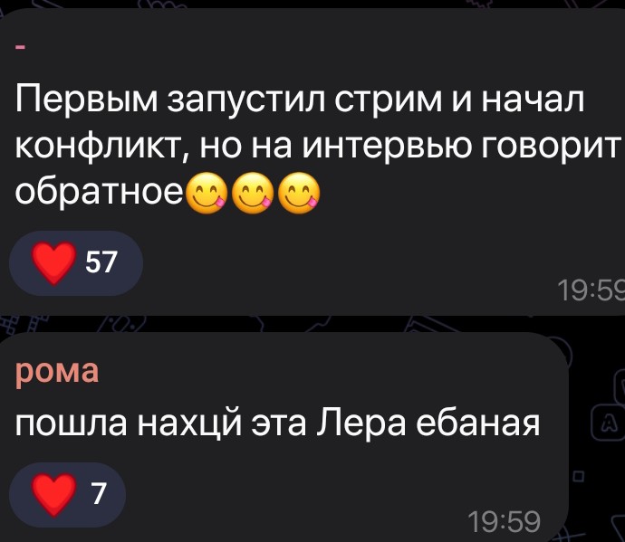 У нас была договорённость держать отношения в секрете, но в один день, сильно расстроившись, она всё рассказала и выставила меня в очень плохом свете. Я же ничего о ней раскрывать не стал, потому что меня убедил Spokoynich этого не делать. Самый главный триггер у меня сыграл от ребят. Потому что я не рассказывал им про нас. А когда все это "вылилось", ребята говорят: "А ты нам пи*дел". После этого ребята отреагировали, что "нам нужно перестать общаться и отдохнуть друг от друга".