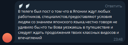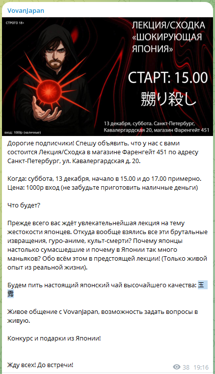 Ребята, я к вам с новостями. Сходка переносится, потому что надо не обсуждать Японию, а действовать там на месте. Сколько можно болтать о «красивых улочках» и «милых сувенирчиках» как Шамов или Торичан. Нужно ехать туда, снимать, добывать материалы, покупать вещи, а потом уже раздавать контент и знания здесь, как взрослые люди, обманывать никого не собираюсьь.