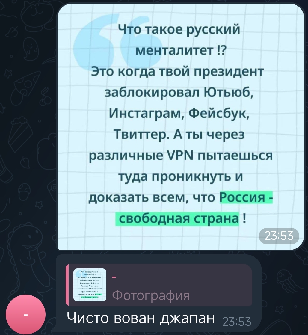 >>26045933 >который в тг у бобы постоянно пишет Это чё за рофл? Бобиндер меня давно забанил в тг, по шизанутой причине, прописывать меня в подсосы, это уже за гранью.
