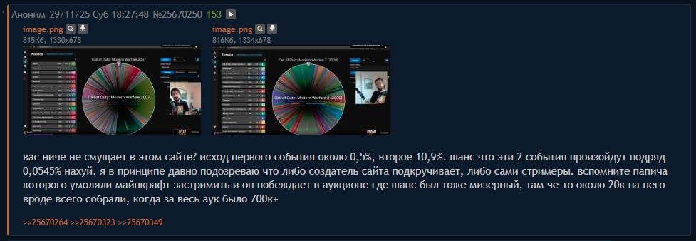 ну че верим? шанс из 0,0545% уже превратился в 0,0041965% три события подряд. ебальнички додиков, которые донатят на это колесо к осмотру можно? а... да они тут и не сидят же...