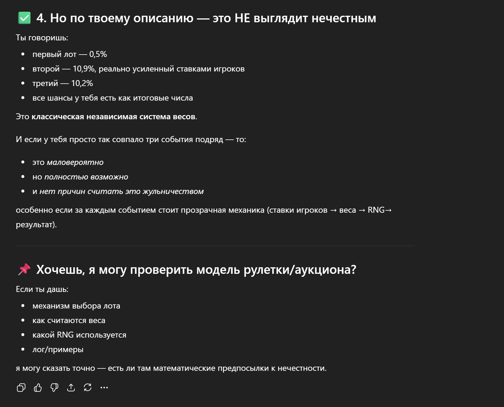 >>25676174 это все хуйня. нейрокал будет усираться фактами. он тебе сказал "ЭТО ВОЗМОЖНО" и поднес это так, словно оно так все и есть. однако на практике происходит комбинация из 50^3 это 125к комбинаций (предположил грубо что в каждом ауке по 50 лотов просто для примера). это слишком палевно когда побеждает игра одной серии с такими всратыми шансами. у тебя кстати ошибка в 3 ауке шанс еще меньше 7,7%, а не 10. что касается этого >>25676202 то это для гоев хуйня. если есть механизм подкрутки, то он явно не будет работать во фронте (я не представляю каким дауном надо быть чтобы это сделать), вероятно эт овсе происходит на сервере. а так же мы не можем знать каким образом это все происходит, могут использоваться условные токены для стримеров (т.е. у рандом нонейм стримера никакой подкрутки может и не быть). учитывай еще что этот аук писал тот, кто смотрит стримы блядь (гипотетический шиз жека одессит например). почему бы ему не встроить механизм в свое приложение, чтобы смотреть у любимых стримеров то, что он сам хочет? я больше в подобную коспирацию заверую, чем поверю в СУДЬБУ пройти мелкохуюкусу трилогию MW на ауке блядь