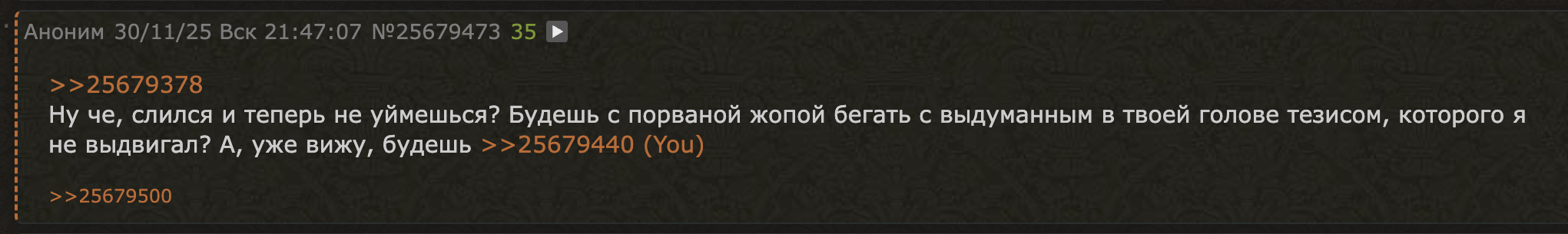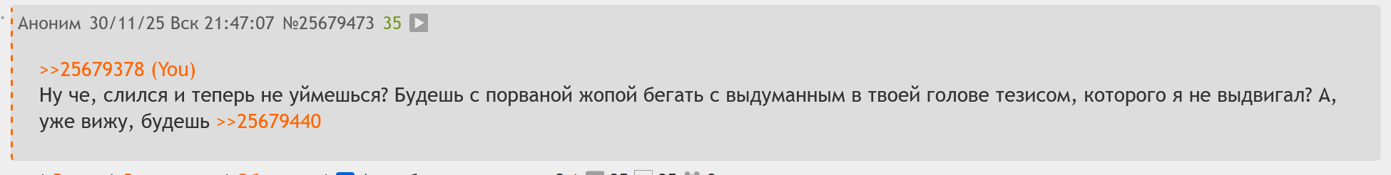 >>25681506 В мёртвом и неактивном треде ты не в состоянии посмотреть на 2 поста выше и увидеть на какой из моих постов ты кукарекнул? Постарайся посмотреть лучше, там всё внятно написано.
