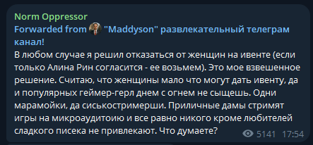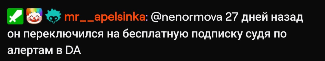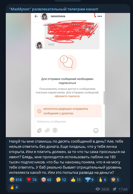 при всем этом он захотел написать в оправдание целый пост в тг о том что у дуры закрыта личка, как будто его заботит ее клевета и нытье на свои 50 зрителей, о том что он ее игнорит и главная нелепость в том, что бусти не единственый их канал связи, в сентябре они общались в дискорде вместе с dedbaldesh