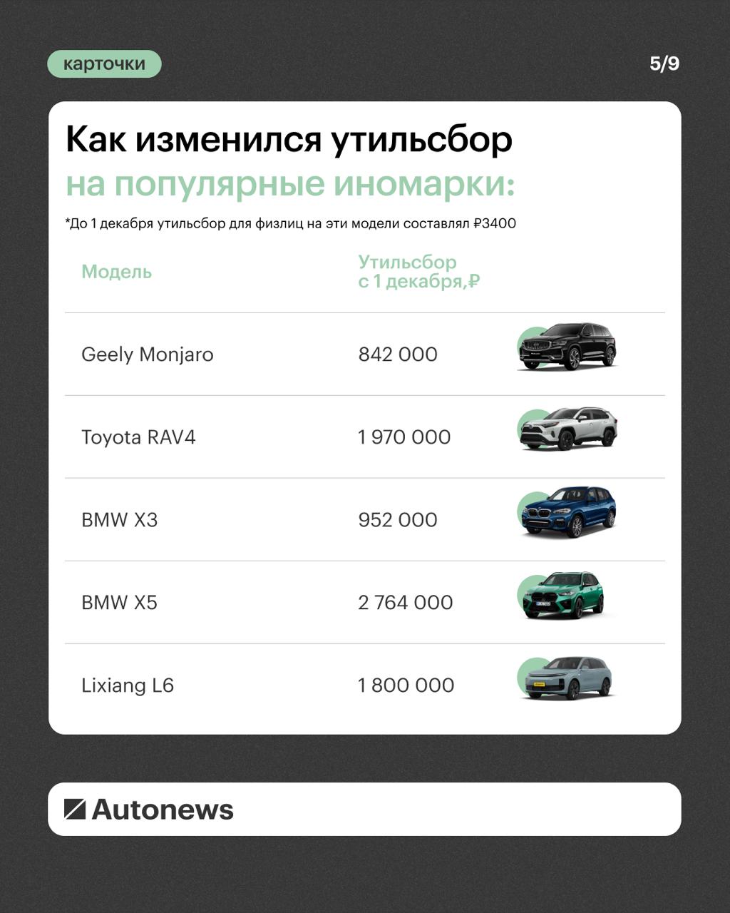 Теперь придётся доплачивать: — Toyota Camry 3.5 — минимум 2,9 млн рублей сверх цены авто. — Kia K5 — плюс 795 тысяч рублей. — BMW M5 — минимум 4 млн рублей. — Lixiang L9 — почти 2 млн рублей вместо прежних 3,4 тысячи.