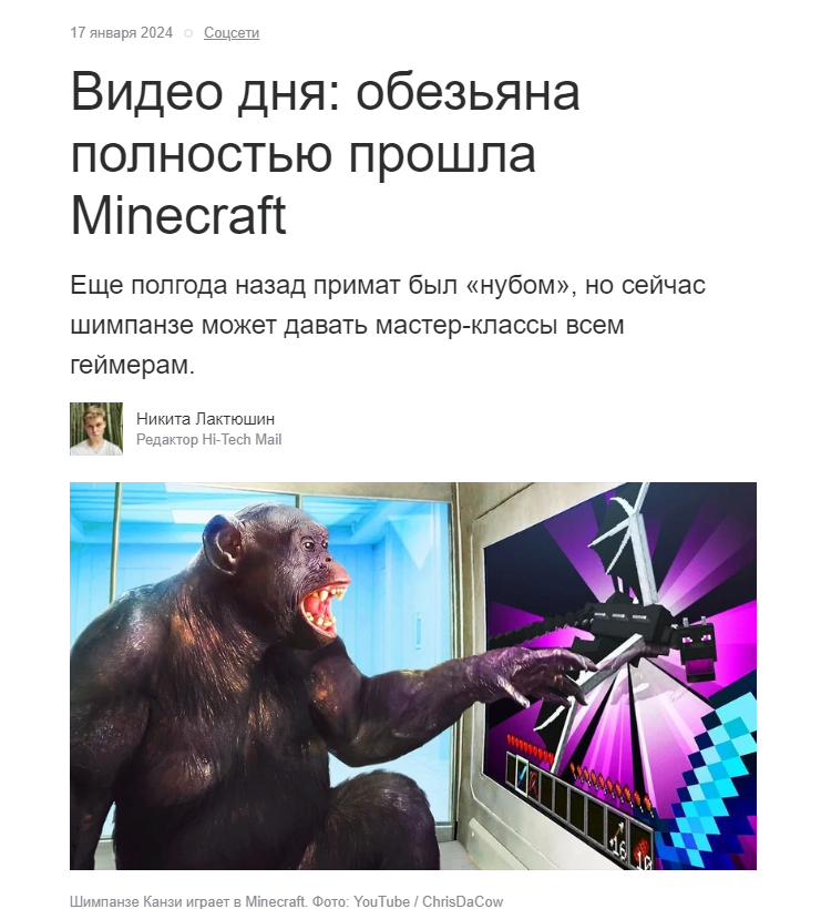 Американские блогеры с YouTube-канала ChrisDaCow научили шимпанзе по кличке Канзи играть в Minecraft — обезьяна настолько преуспела в своем деле, что ей удалось полностью пройти игру, то есть убить «Дракона Края».