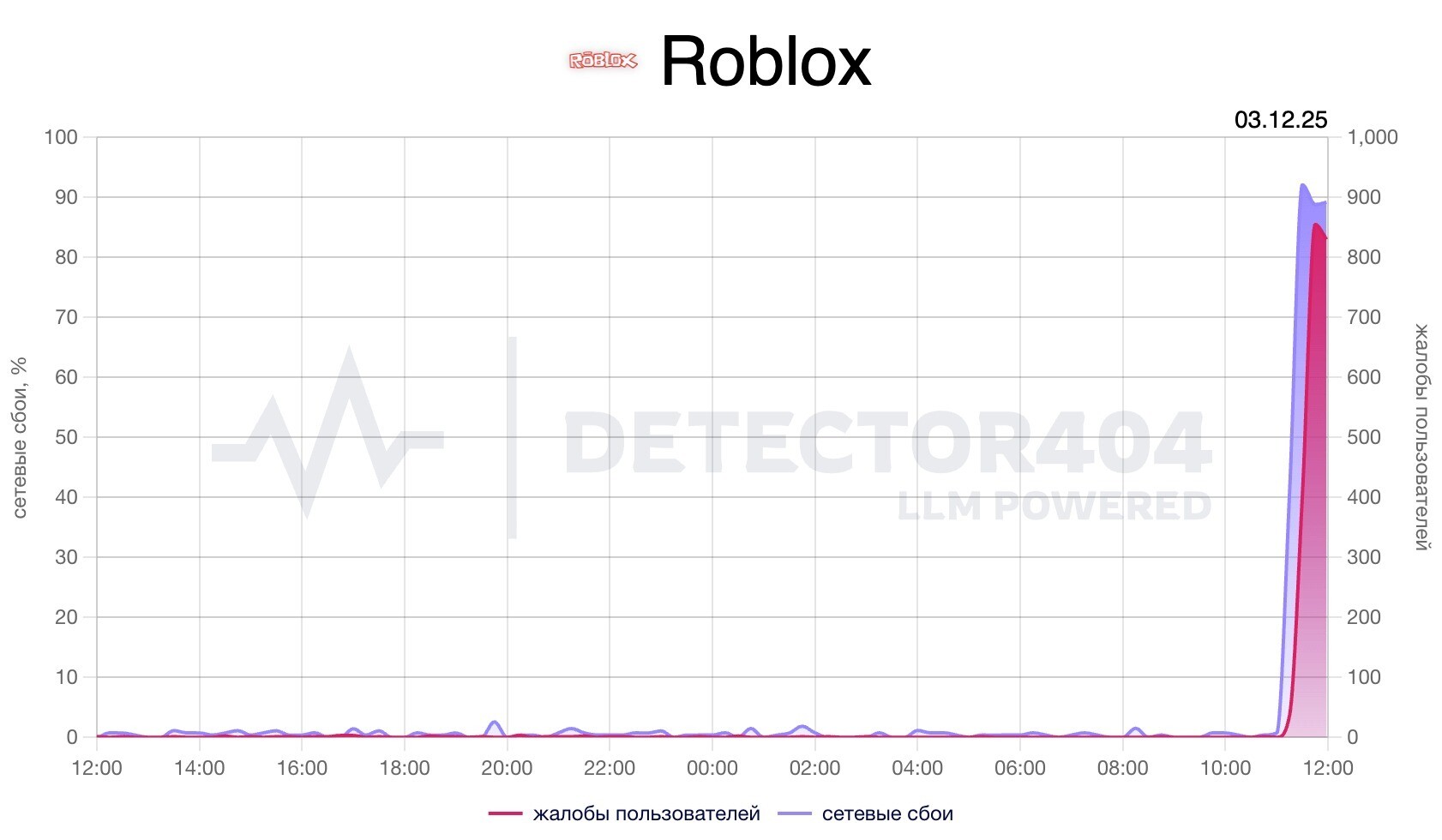 О проблемах с доступом к Roblox российские пользователи начали сообщать около 11:00 по Москве 3 декабря 2025 года. На 12:00 по Москве на Downdetector больше 2100 жалоб. В большинстве сообщений говорится, что Roblox «не работает» или «не загружается». Некоторые пользователи отмечают, что сервис не открывается с российских IP-адресов, и выдвигают предположение о блокировке Роскомнадзором. Накануне регулятор сообщил, что выявил в Roblox «запрещённый» и «неподобающий» для детей контент. Блокировку сервиса также обсуждали в Госдуме. На момент написания новости Роскомнадзор официально не сообщал о блокировке Roblox.