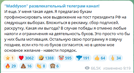 Бля, а реально представь Илюху президентом РФ. Ведь потенциально, такое возможно. У него большая активная аудитория. Зумеры не смотрят, но слышали, что это тоже стример, чел из интернета. То есть ближе к ним, чем к их родителям, для которых интернет это ватсап и тикток. И ведь какие-нибудь буки с ебанутой рекламой, типа тех которые Папича вывозили, могут залететь и финансированием. Но все это, конечно, эсли будет окно возможностей. Как он будет вот этим своим голосом выступать перед страной. Как бабки бы тряслись от того кто это вообще такой и его слов. Какие законы по рофлу бы подписал. Это был бы буквально наш Дональд Трамп.