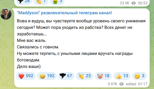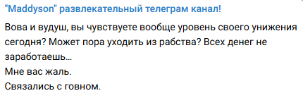 Как вы думаете, будет ли вся эта пиздобратия как-нибудь мстить Мэддисону? Если да, то как? Удивительно, но Дианочка решила не реагировать, но кураторы этой хуйни и люди, которые за ними стоят, явно способны и на какое-нибудь зло.