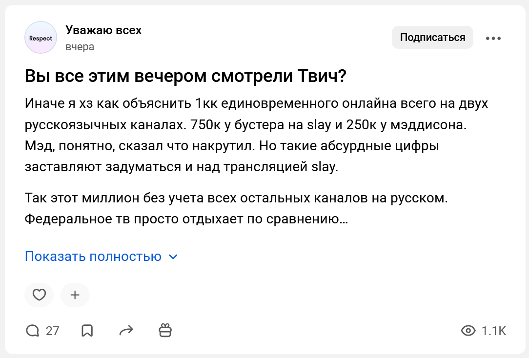 >>25706757 Ну вот он и говорит у него есть чё-то порядка 6к реальных зрителей, но никак не 50к и не 30к. Это реально тупость, тот кто первым начал заниматься этой хуйнёй открыл ящик пандоры потому что теперь хуй измеришь популярность. И заднюю конечно же тоже никто не даст, а твичу похуй вообще.