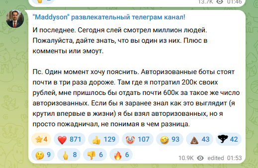 >>25707635 Не с буками, буки здесь просто движущая сила. С ботами может бороться только твич, всё что может сделать Илья со своей стороны это показать абсурдность того как сейчас выглядит ру-сегмент твича и привлечь внимание к тому что людей с улицы буквально за небольшое время делают звёздами, а те в свою очередь хуеют.
