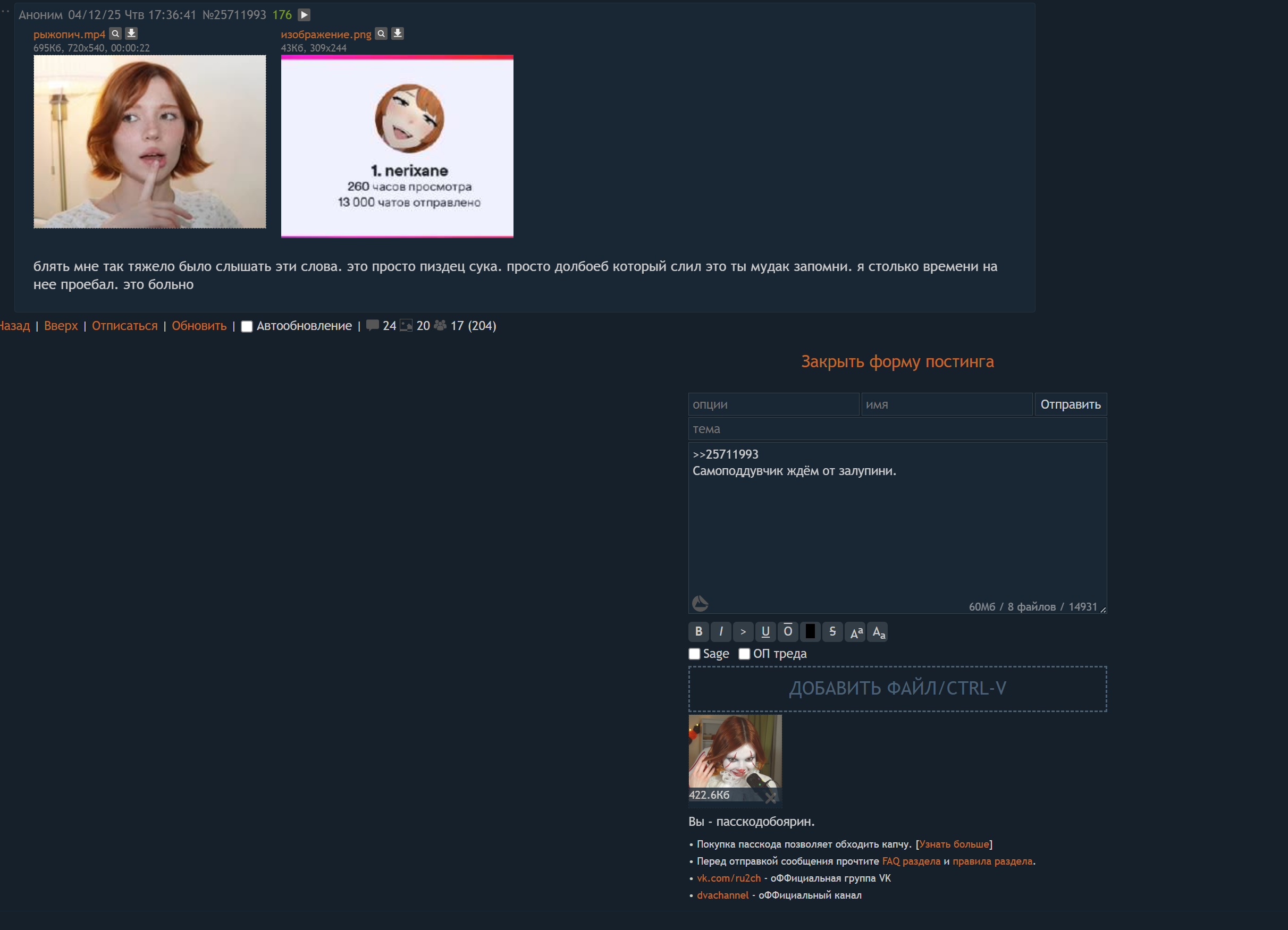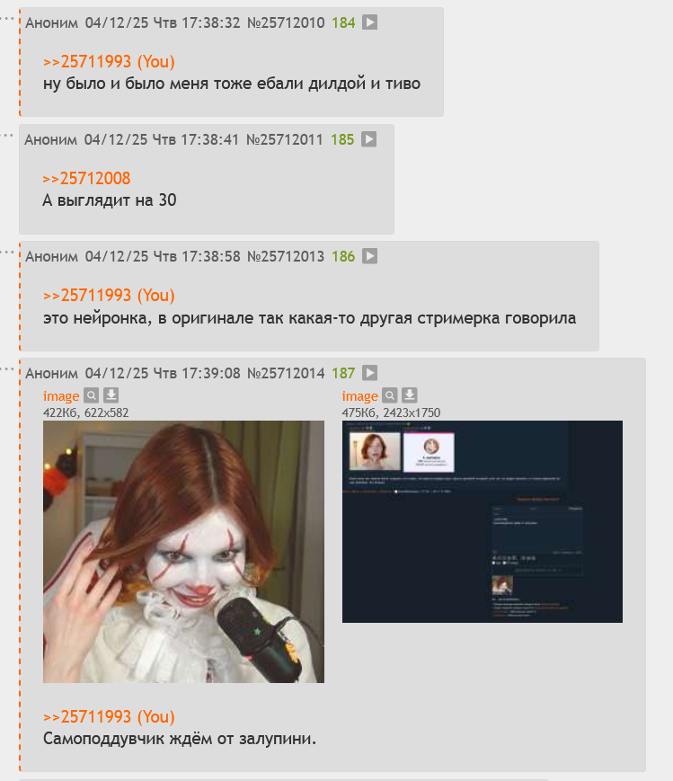 >>25712498 да, я не выкупил орущее быдлецо (чмодье), которое как обрыга пьяная орала весь стрим, будучи наряженным в женщину (который раз?), позвал смотреть на это все ребенка девочку. объясни мне глубину этой экспрессии, что он хотел зрителю этим сказать на самом деле? скрытый смысл? давай блесни извилиной своей