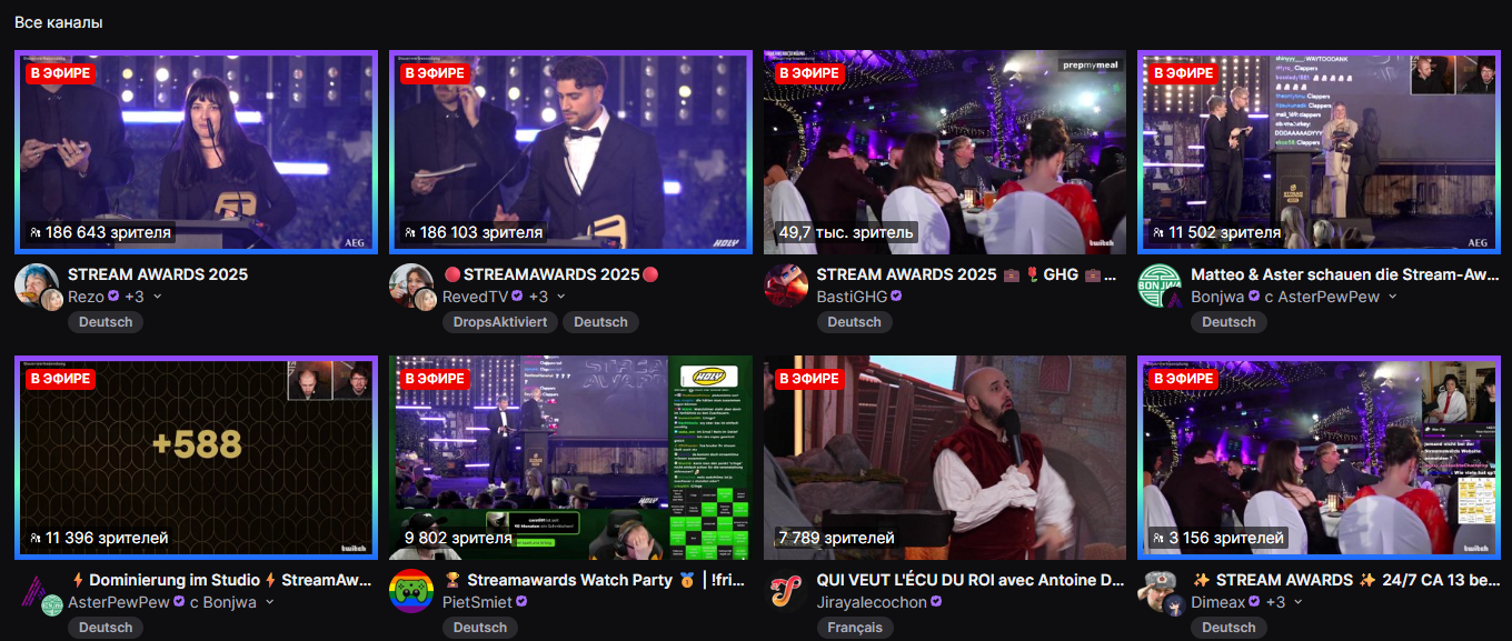 Ару бля. Тут кто-то писал, что твич слеем превращают в подобие тв и голубых огоньков. Сейчас включил немецкий авордс, вот реально пахнет бабкинским телевидением, убожество лютое.