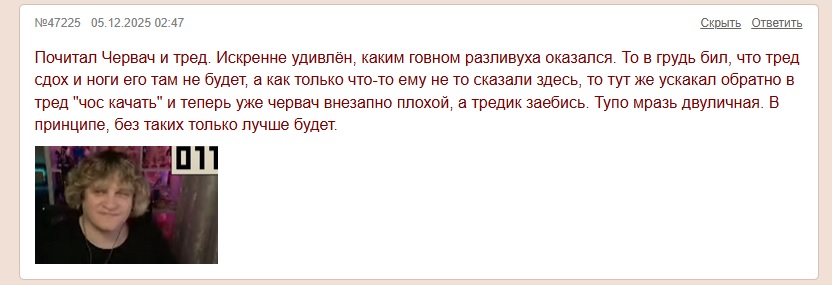Ну что ж, возродил черветред, теперь возвращаюсь в легитимный червач качать топовый чёс. Приятно осознавать, что весь черведвиж на мне держится, конечно, но и ответственность большая. Бывайте, ихтиандры хуевы!