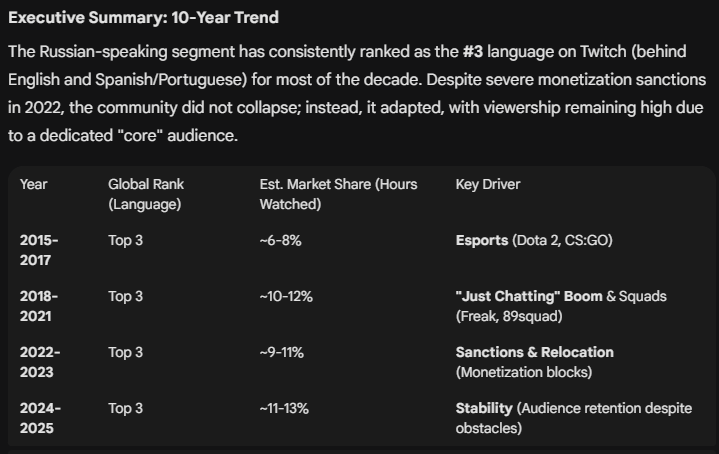 >>25716370 → Потому что жопич так сказал? Хуйню не неси. Твич монополист среди стрим площадок и русский язык всегда входил там в топ3. Так что аудитории там предостаточно.