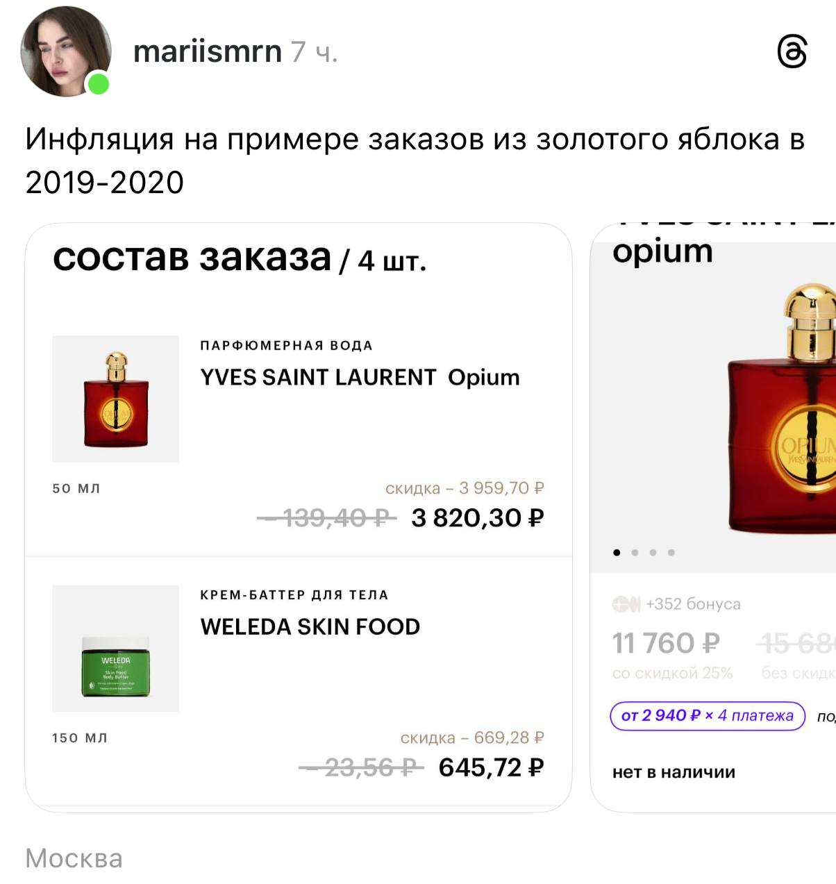 В сети форсится наглядный пример инфляции в Золотом яблоке. Вдумайтесь, всего за 5 лет цены на косметику в среднем подскочили аж в 3 раза (300%). Ну и где эти 5% в год?