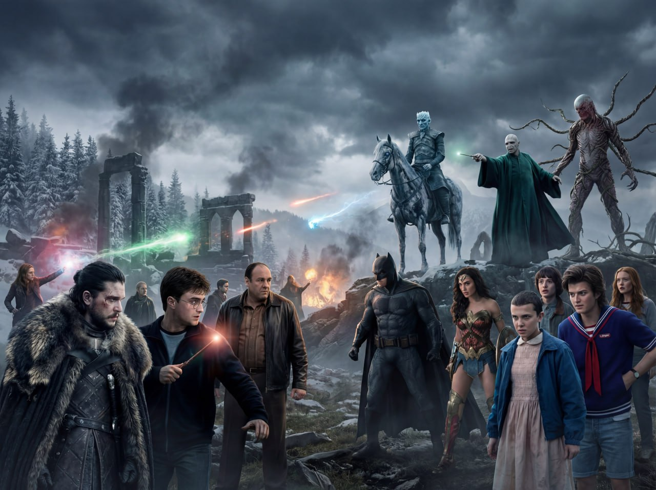 • Гарри Поттер / Фантастические твари • Вселенная DC • Властелин колец • Безумный Макс • Матрица • Дюна • Друзья • Наследники • Мир Дикого Запада • Белый Лотос • Клан Сопрано • The Last of Us • Эйфория • Игра престолов / Дом дракона • Настоящий детектив • Теория Большого взрыва • Looney Tunes • Том и Джерри • Scooby-Doo • Mortal Kombat • IT / Оно