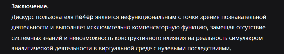 >>25720075 О чём можно говорить с человеком, который жалуется что некий Чмотик в 5 утра вайпал тред? Если что где-то примерно с 3-х до 9 утра в треде вообще нет никакого осозананного постинга и это всегда было время самого свободного общения когда такие вахтёры как ты не пишут доносы на каждый неугодный им пост.