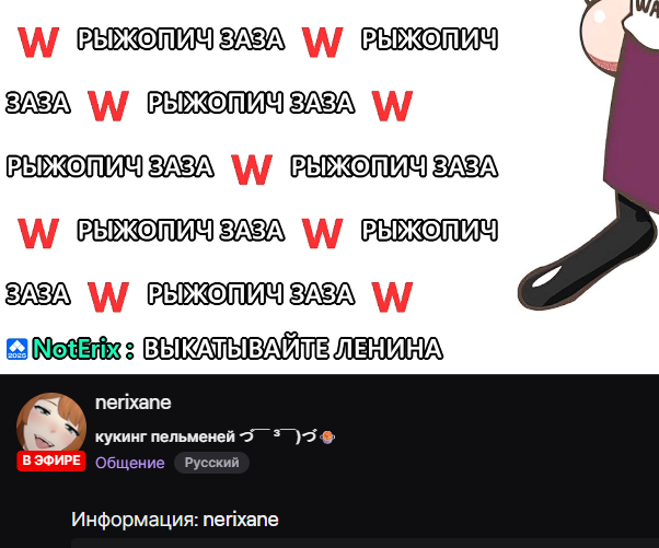 Ненормеры, готовим донаты жопичу с просьбами взять ее на ивент и с мнением о том, что лучше бы взяли ее вместо рыжопич на стрим слея Рыжоперы, готовим донаты жопичу с придуманными оправданиями ее нулевости на стриме слея и просьбами дать 3 шанс рыжуле Базовики, готовим донаты с просьбами захуярить 20 ударов в спейс ворс и залететь в Саню Квентина