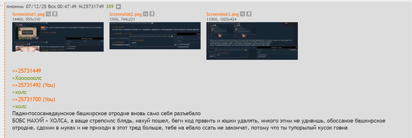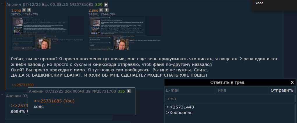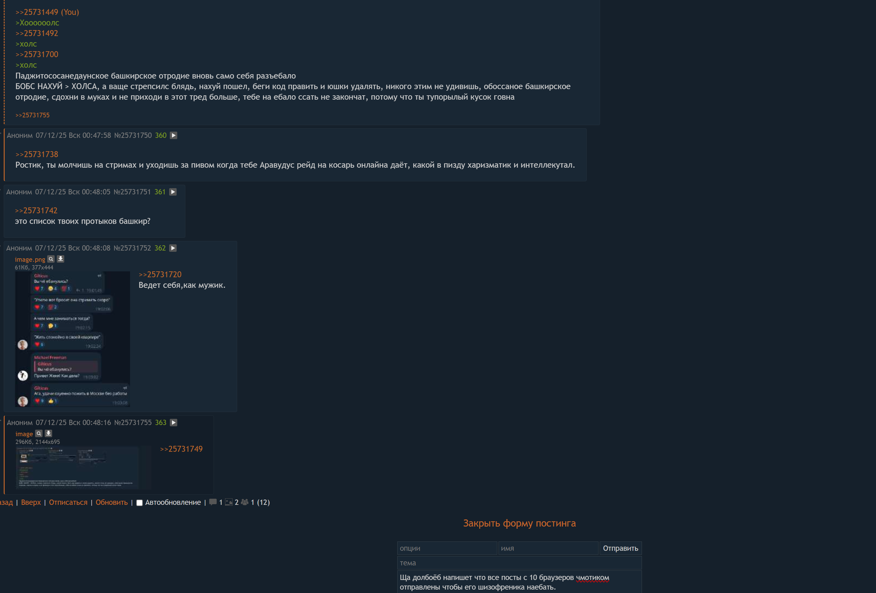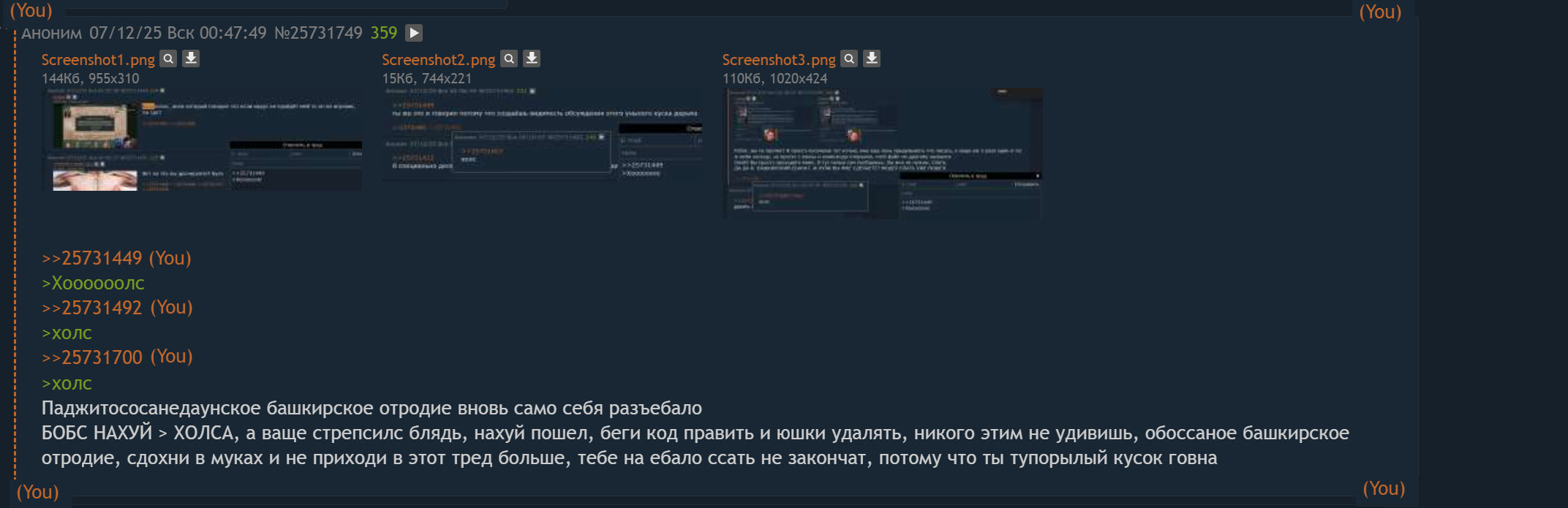 Ребят, вы не против? Я просто посеменю тут ночью, мне еще лень придумывать что писать, я ваще аж 2 раза один и тот ж вебм запощу, но просто с куклы и юникскода отправлю, чтоб файл по-другому назвался Окей? Вы просто проходите мимо. Я тут ночью сам пообщаюсь. Вы мне не нужны. Спите. ДА ДА Я. БАШКИРСКИЙ ЕБАНАТ. И ХУЛИ ВЫ МНЕ СДЕЛАЕТЕ? МОДЕР СПАТЬ УЖЕ ПОШЕЛ