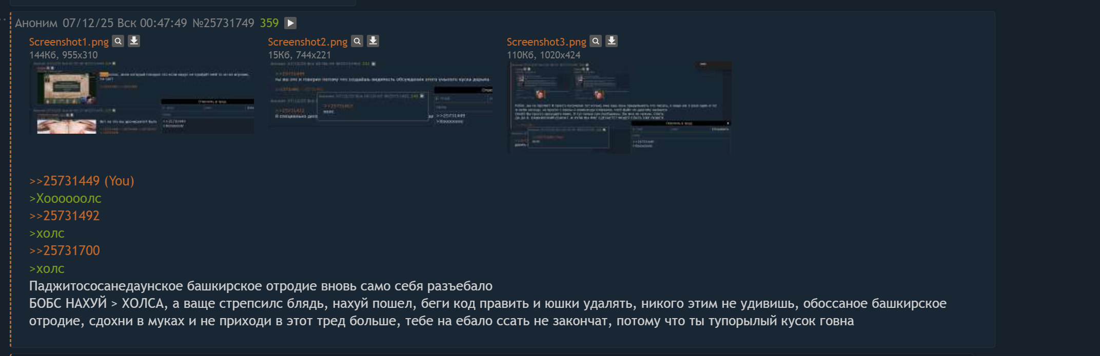 >стереть юшку дело 2 сек или типо веришь, что кто-то поверит, что ты не сидел в коде не дрочил себе эту хуйню заранее чтоли >БОБС НАХУЙ > ХОЛСА, а ваще стрепсилс блядь, нахуй пошел, беги код править и юшки удалять, никого этим не удивишь >не еще лень придумывать что писать, я ваще аж 2 раза один и тот ж вебм запощу, но просто с куклы и юникскода отправлю Я без комментариев это оставлю, кто помнит летний 175х-гейт тот помнит, это тот же шизофреник.