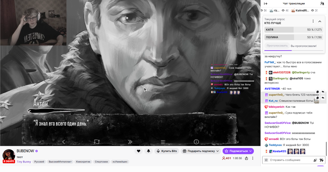 илья с сашей решили потестить новых ботов на бубенове боты не только пишут хуйню в чат так ещё и в голосовании участвуют значит готовится вернутся на твич и уверен что его купят буки а может уже предложили