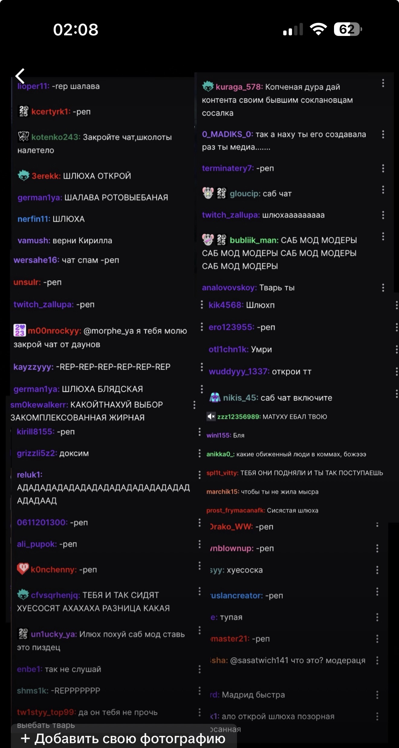 зашел почитать чат морфи о котором тут писали и думал что преувеличивают но катюхе лучше сейчас съебаться нахуй пока далеко не зашло. какие же дауны у сасавота. вот я ни за что не поверю что например аудитория вовы или эвелона побежит спамить девушке пожелания смерти параллельно называя ее конченой выблядью просто за то что она не хочет чтоб над ней 50 к в чате плюс весь тик ток в этой хуйне будет, какие же отсталые дети даже жаль ее стало если честно