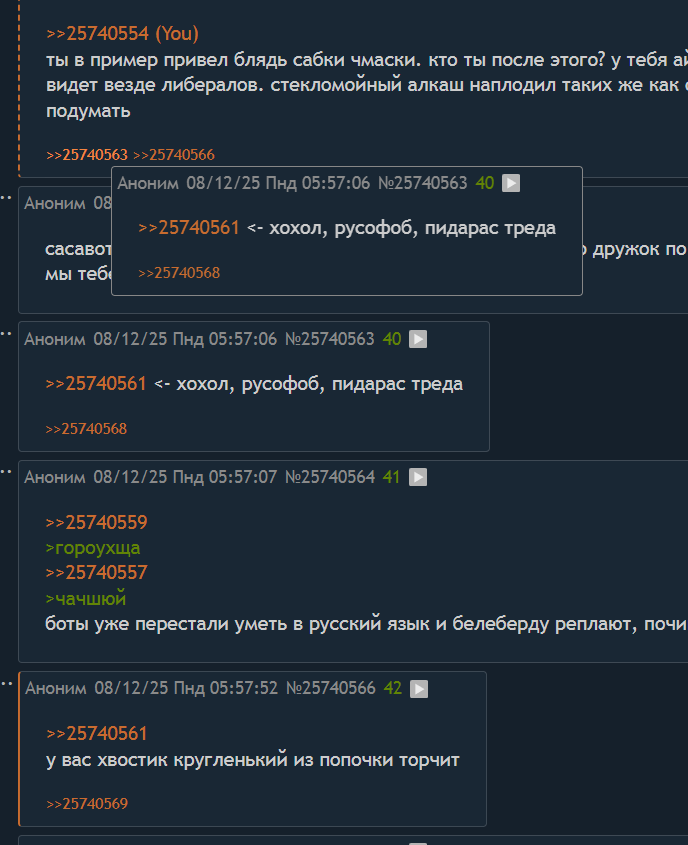 >>25741138 Вообще у вудушао очень хорошее чувство положений. Сразу видно, что он неиронично был альфачом в молодости. Он прям в курсе на кого стоит быковать и в каких пределах, а на кого нет. Вот в Юзе сразу увидел слабое звено и начал просто измываться. Вчера с Илюхой говорил кротко, мямлил и подчинялся, но когда газонюх захотел вмешаться — вудуш его сразу попустил резко. То есть он прям вот чует кто в комнате есть кто, и какое положение он в этой комнате занимает сам.