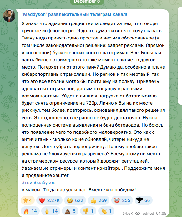 от этого выиграют ВСЕ, прежде всего те же самые буки, эти дауны вместо разброса денег на хуету, лучше бы заставили всех своих стримеров подрубать ретрансы на топ платформы