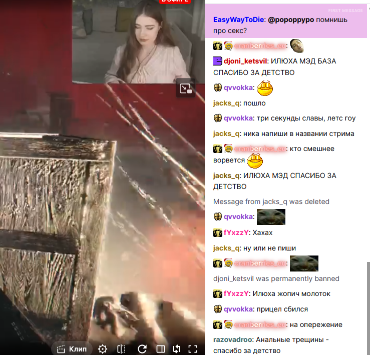 -Чмудуша даванули вчера + на головку прыснули -Лысую хуйню даванули на неделю с твича -Диана сама проткнулась после видоса Ильи где он несет голову некой девушки через пустыню