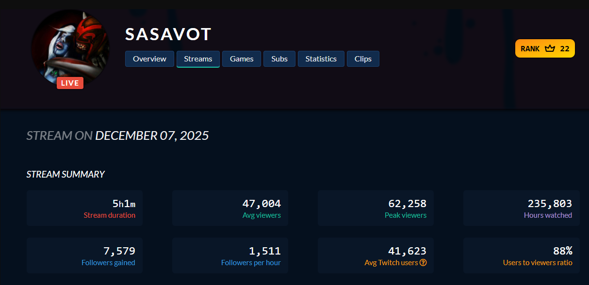 Средний онлайн Сасавота в 2022 году - 85 человек. В 2023 году случилось чудо. Ну знаете как это всегда бывает. Стримишь на 100 тел, а потом внезапно входишь в прайм