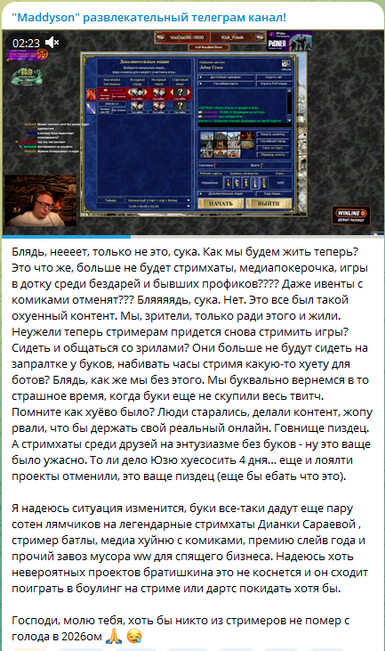 Ой, как зялко, буки уйдут с твича, ой как зялко, а за то что букам перекроют краник по отмыву бабла через стримеров, то в следующем году, твичок очень быстро заблокируют и все, я подчеркиваю все уйдут на ВК стримить, где о чудо, будут и буки и вся схема будет работать дальше. А вы лишитесь твича, без танцев с бубном. А лишит вас твича ваш любимый флюгер, борец за справедливость, тот самый помощник депутата от партии ЛДПР, пиздабол и мудак Ильюша Чмедисон. Не забудьте потом ему сказать спасибо за это. Просьба сделать скриншот и повесить в рамочку.